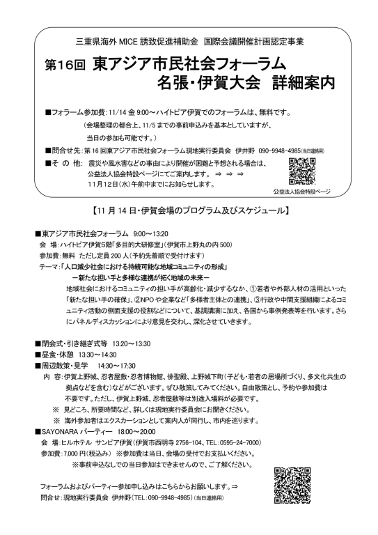 このたび、名張市および伊賀市を会場に「第16回東アジア市民社会フォーラム」が開催されます。