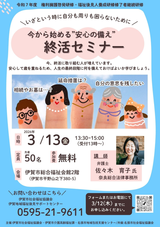 〔申込・問い合わせ先〕 伊賀地域福祉後見サポートセンター(社会福祉法人 伊賀市社会福祉協議会) 電話:0595-21-9611〔主催〕